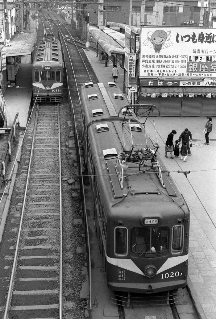 | 八幡駅前行 1000形 1020,楠橋行 1000形 1048 1982.3 黒崎駅前 〔西日本鉄道 北九州本線〕 |