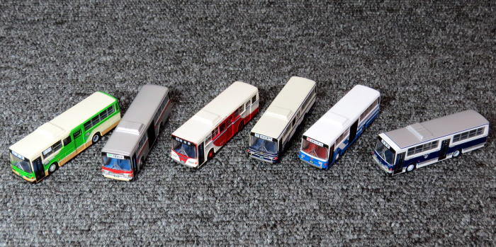 路線バスは,スタイル・塗色から活躍した時期・地域を特定できるため, THE バス・コレクションの収集により, 各地域を走った路線バスの歴史を感じることもできます。 THE バス・コレクション第6弾(2005.5発売)を紹介します。 富士重工5Eと日野RJの2種類のバスが12事業者の塗色でモデル化されています。 富士重工5Eは昭和57年/1982年登場, モデルはリベットレス化した後期バージョン車で昭和59年/1984年登場。 日野RJは1980〜2004年に製造の中型バス・レインボーシリーズのうち 昭和58年/1983年登場のマイナーチェンジ後の後期型バスです。 富士重工5E ⇒ 東京都交通局,東急バス,関東バス,名古屋市交通局,九州産業交通 国鉄バス 日野RJ ⇒ 東京都交通局,阿寒バス,富士急行,大阪市交通局,南国交通,国鉄バス シークレットは,富士重工5E 東急バス・ワンロマ仕様,日野RJ 東京都交通局(青梅支所仕様) |