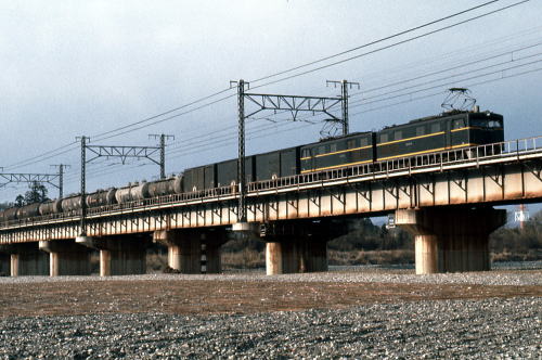 EH10牽引貨物列車 EH10は,1954年登場の 東海道・山陽本線の 貨物列車牽引機関車。 国鉄最大級の電気機関車。 1973.10.24 河瀬-稲枝 〔東海道本線〕 |