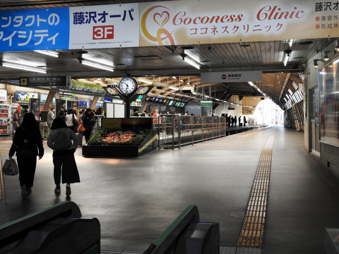 江ノ電の起点・藤沢駅は,小田急百貨店の2階にあります。 降車・乗車ホーム2面に1線の構造で, 到着した電車から乗客が降車し,乗車して発車していきます。 4輌編成の電車がホームいっぱいに停まります。 ドーム屋根,側壁の円形窓など地方鉄道・起点駅のムードが充満しています。 初冬の陽射しがホームに映っていました。 |