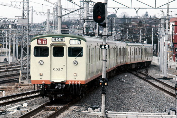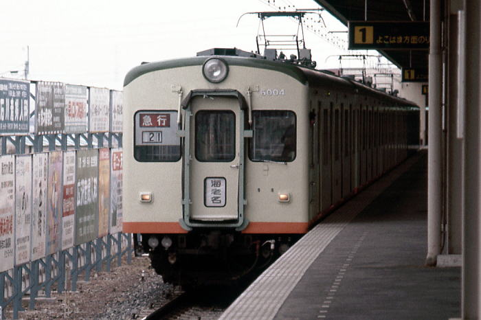 | 黄緑車体に濃緑とオレンジの帯を配した塗色の新6000系 1975 海老名〔相模鉄道 本線〕 |