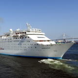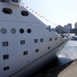 “オーシャン・ドリーム”はカーニバル・クルーズ・ラインがTropicale(トロピカール)として 1981年/昭和56年に,デンマークで建造されました。 2001年/平成13年,コスタ・クルーズに移籍して“Costa Tropicale”に改名, さらに,2008年/平成20年,プルマントゥール・クルーズに売却され“Ocean Dream”に改名されました。 現在は,国際交流を目的とするNGOであるピースボートが地球一周の船旅を運航しています。 “オーシャン・ドリーム”は,2012年5月に横浜大桟橋に初来航しました。 今回は,56日間の第96回オセアニア一周クルーズを終えて帰港しました。 13時には終着・神戸に向けて出港しました。 |