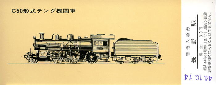 1969年/昭和44年10月14日,長野鉄道管理局が第97回鉄道記念日を記念して発行した記念入場券です。 金沢鉄道管理局,長野鉄道管理局,静岡鉄道管理局が連携して, 統一デザインで,日本の代表的な蒸気機関車のペン画の記念入場券を発行しました。 長野鉄道管理局は,2120,9700,9600,C50,C56,D51 の記念入場券を発行しました。 当時,路線の開業・廃止,列車の新設・廃止など鉄道に直接関わる出来事のほか, 鉄道車輌,観光地,特産物などをデザインした 記念入場券,記念急行券,記念乗車券も頻繁に発行されていました。 |