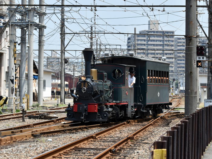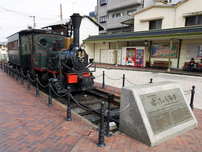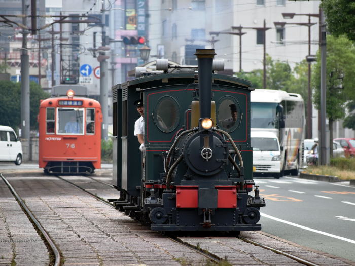 坊っちゃん列車は, 夏目漱石の小説“坊っちゃん”に,“マッチ箱のような汽車”として登場する 軽便鉄道時代の蒸気機関車牽引列車です。 蒸気機関車は,独逸クラウス社のB型蒸気機関車でした。 2001年から,路面電車が走る松山市内線を, 蒸気機関車に仕立てたディーゼル機関車により復元された“坊っちゃん列車”, 第1編成 D1形1+客車ハ1形1・2,第2編成 D2形14+客車ハ31形31が 運行しています。 列車には,伊予鉄道創業時の再現制服を着用した機関士と車掌が乗務し, ドラフト音をスピーカで鳴らし,当時の雰囲気作りに工夫しています。 街中を路面電車に混じって走るSL列車は,撮影対象として面白いと思います。 |