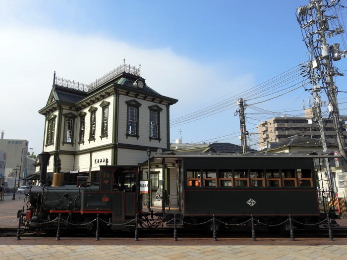 | 道後温泉駅舎前に展示中の坊っちゃん列車(第2編成) 2018.6.9 道後温泉〔伊予鉄道 城南線〕 |