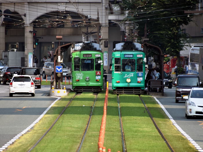 酷暑の続く熊本市街,緑化された線路を走る緑塗色の熊本市電を撮影しました。