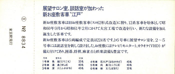 | ◆新お座敷客車“江戸”完成記念入場券 1986年/昭和61年3月5日発行 | ||