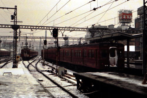 1969年/昭和44年,大阪に雪が積もった日に, 国鉄・天王寺駅付近と近鉄・上本町駅で列車を撮影しました。 当時の大阪環状線は103系を投入開始の時で,101系が主力でした。 また,関西本線は非電化であり, キハ35系を主力に,雑多なディーゼルカーが運転されていました。 近畿日本鉄道の難波線は開業しておらず, 近鉄・大阪線/奈良線の列車は,大阪上本町から発着していました。 大阪線は旧型車が主力,奈良線は架線昇圧のため新型車が主力でした。 奈良線用900系は,ベージュ車体に青ライン塗色でしたが, その他,一般用電車はレッドマルーン塗色でした。 |