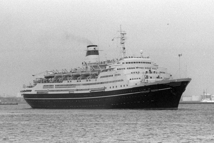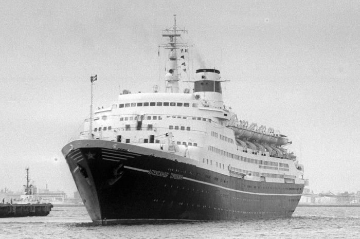1987年/昭和62年,横浜大桟橋を出港するソ連客船 ALEXANDR PUSHKINです。