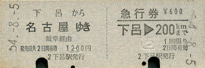 一葉式乗車券・急行券 下呂から名古屋ゆき乗車券 1200円 急行券 200kmまで 600円 1979年/昭和54年8月5日 下呂駅発行 |
