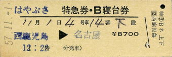 | はやぶさ・西鹿児島→名古屋・B下段・8700円 昭和57年11月1日・西鹿児島駅発行 |