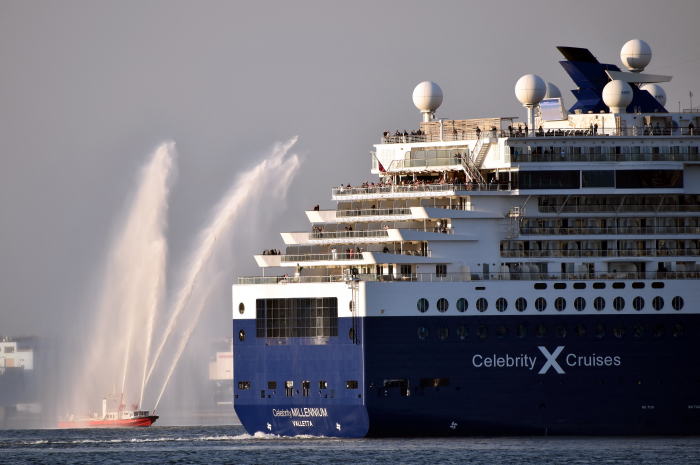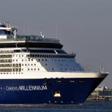 セレブリティ・ミレミアムは,米国セレブリティ・クルーズが運航する9万トンクラスの大型客船です。 セレブリティ・クルーズは,同型客船4隻を保有しており, 1番船であるセレブリティ・ミレミアムは,2000年に建造され,新しい千年紀を記念して命名されました。 白と濃紺の角ばったフォルムの船体と,濃紺の台形に白色のXがデザインされたファンネルが特徴です。 船体下部塗色が濃紺一色に変更になり,重厚感が醸し出されました。 横浜には,2013年/平成25年4月に初来航しました。 7年連続の寄港です。 2019年は,4月,10月,11月に来港します。 17時,日本周遊クルーズで清水に向けて出航しました。4月26日に横浜に帰港します。 |