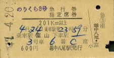 のりくら8号・富山→・600円 昭和47年4月20日・越中八尾駅発行 |