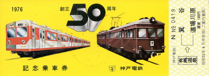 | ◆神戸電鉄創立50周年記念乗車券 1976年/昭和51年3月発行 | ||