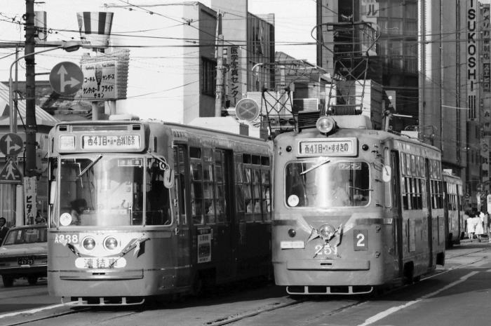| A830形 A837+A838,250形 251 1974.8 西四丁目〔札幌市交通局 一条・山鼻軌道線〕 | ||
