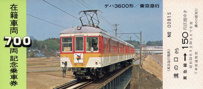 | ◆東京急行電鉄・在籍車両700両記念乗車券 1978年/昭和53年 溝の口駅発行 | ||