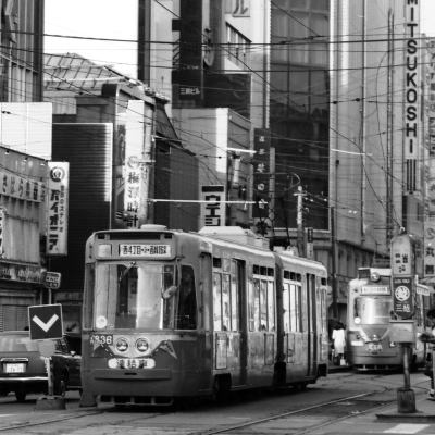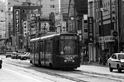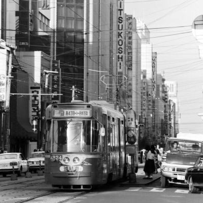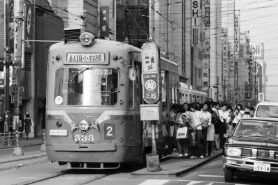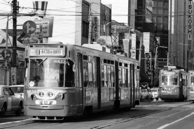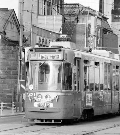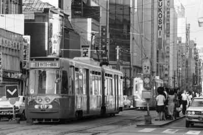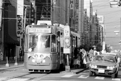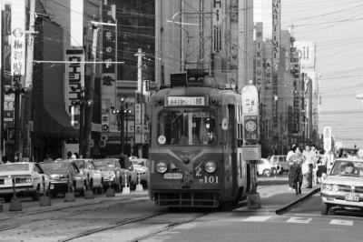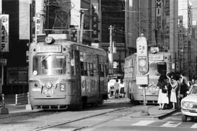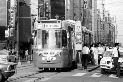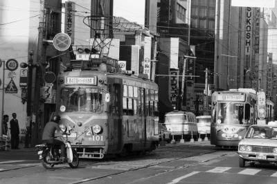 終点 西四丁目で,頻繁に発着する札幌市電を撮影しました。 当時の路線は,すすきの-西四丁目のC字形路線であったため, 西四丁目では,到着した市電が折返し運転をしていました。 多彩な形式の市電がつぎつぎに到着,折返し発車していきました。 ヨーロピアンスタイルの連接車A820形,A830形が運用されていましたが, 1976年に運行が中止になり, A830形は名古屋鉄道に譲渡,岐阜市内線に運用されました。 当時の市電は,濃いベージュとモスグリーンのツートンカラー塗色でした。 札幌の街に似合いました。 |