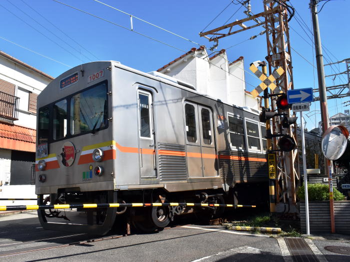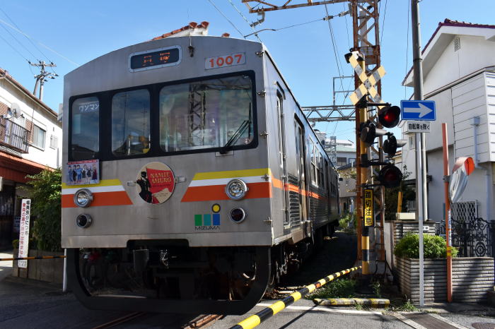| 踏切を通過する貝塚行普通 1000形・1007-1008 2019.9.3 貝塚-貝塚市役所前〔水間鉄道 水間線〕 |
