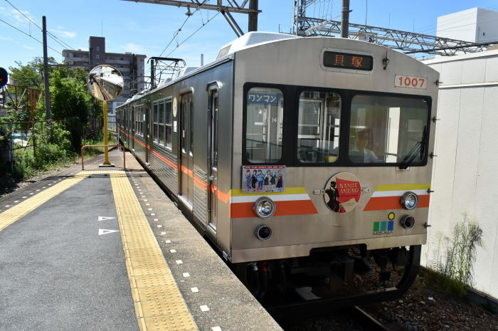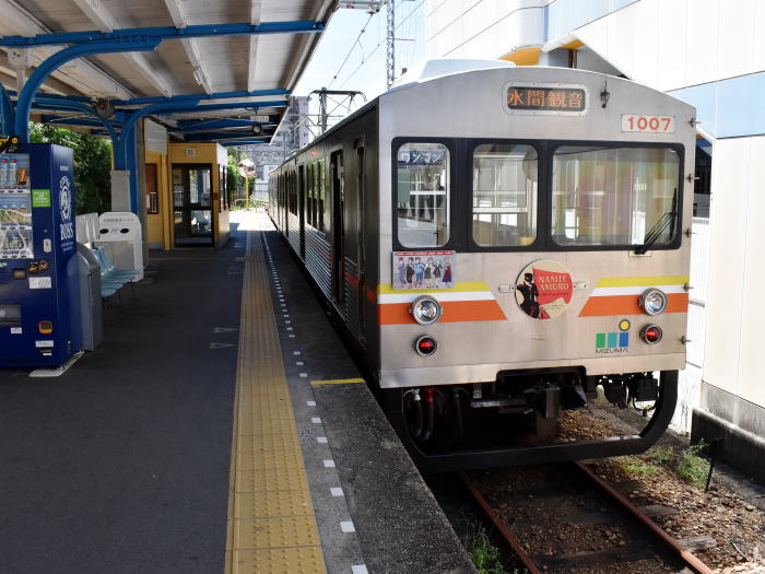 | 貝塚駅に到着する普通 1000形・1007-1008 2019.9.3 貝塚〔水間鉄道 水間線〕 |