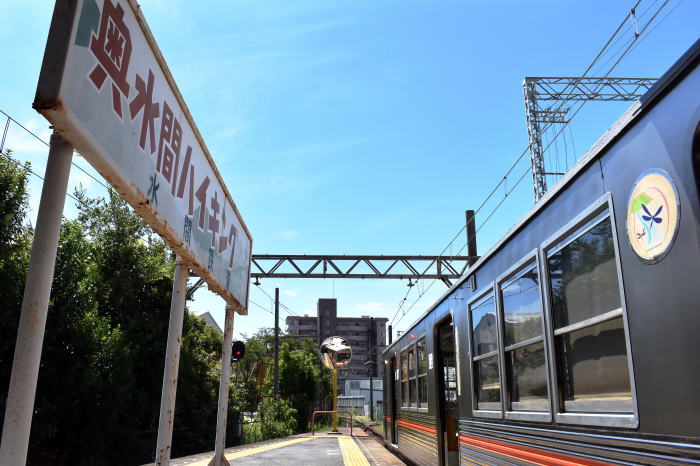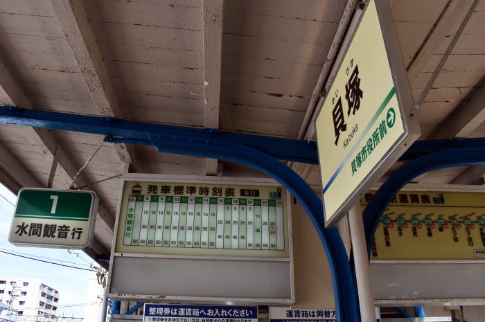 貝塚駅は,南海電鉄・南海本線と水間鉄道・水間線の駅です。 南海電鉄の貝塚駅が橋上駅であるのに対し,水間鉄道の貝塚駅は地上駅です。 南海・貝塚駅の改札を通り階段を降りた出口に,水間鉄道の改札があります。 水間鉄道・貝塚駅は,2輌編成が発着できる頭端式1面2線の小規模な構造です。 ホームには,色褪せた奥水間ハイキングの看板がありました。 水間観音から到着した電車は, 数分間で乗降を済ませ,水間観音に折返して行きました。 |
