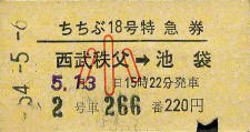 | ちちぶ8号・西武秩父→池袋・500円 昭和61年5月10日・西武秩父駅発行 |