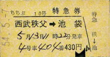ちちぶ10号・飯能→池袋・250円 昭和54年5月13日・飯能駅発行 |