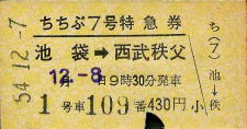 ちちぶ7号・池袋→西武秩父・430円 昭和54年12月7日・池袋駅発行 |