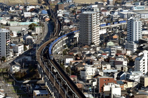 | 岐阜 東空散歩 ◆JR岐阜駅の西にある岐阜シティ・タワー43の展望台から JR東海道本線・高山本線,名古屋鉄道・名古屋本線を 走る列車を撮影しました。 東方向には,JR東海道本線・高山本線, 名古屋鉄道・名古屋本線(名鉄岐阜-加納)を俯瞰できました。 |