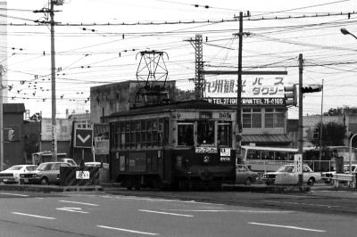 撮影時の1975年/昭和50年路線大幅縮小前には, 66形,200形,300形,501形・551形,561形と 2車体連接車1001形・1101形・1201形・1301形が運用されていました。 1975年11月2日以降は,営業線は循環線と貝塚線のみになり, 路面電車の一部は北九州線に移動しましたが,多くは廃車になりました。 |