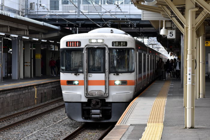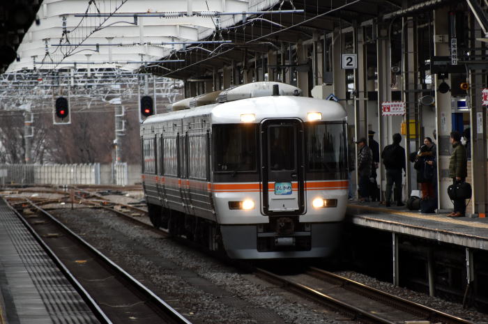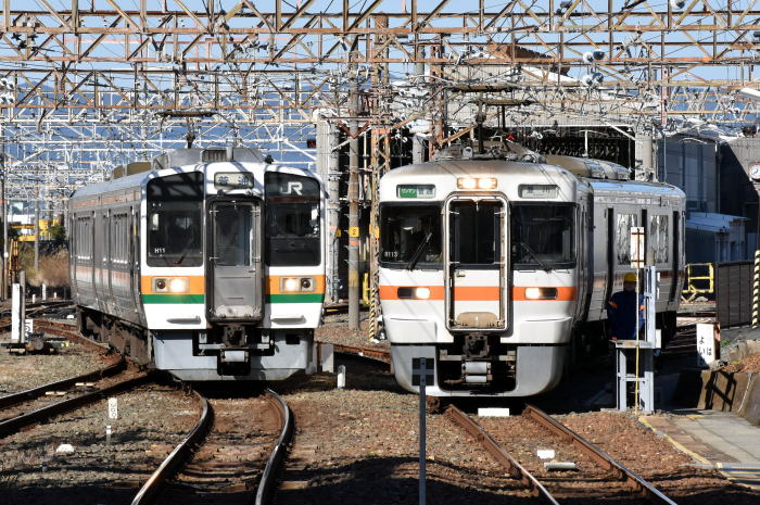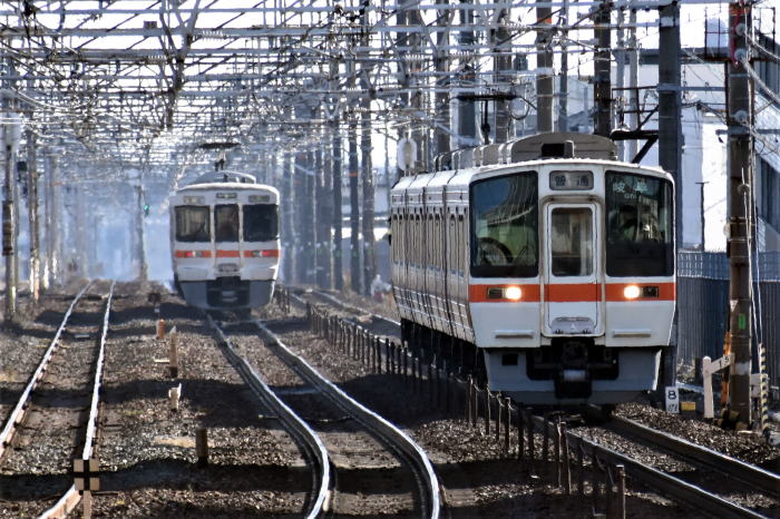 | 稲沢駅に到着する岐阜行311系普通列車と発車した豊橋行313系普通列車 |