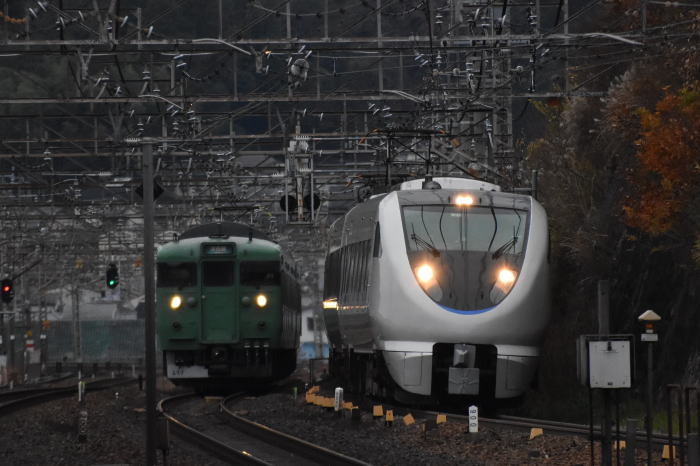 | 山科駅を通過する683系サンダーバード31と到着する湖西線直通115系普通列車 |