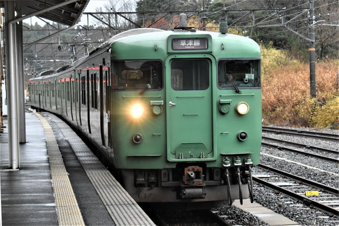 | 柘植駅に到着する草津線の普通列車・115系 |