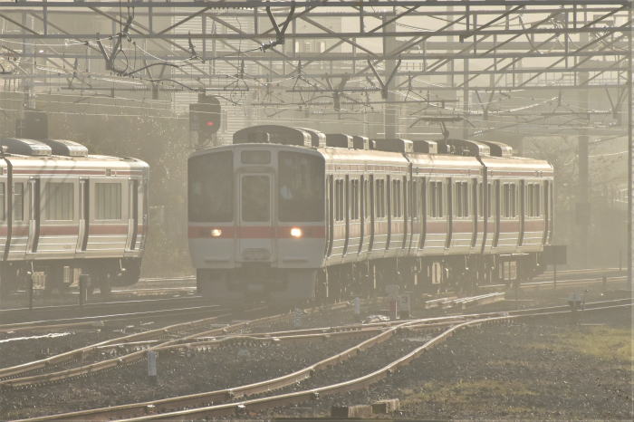 | 朝霧の中を刈谷駅に到着する普通列車・311系 |