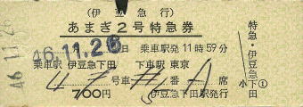 | あまぎ2号・伊豆急下田→東京・700円 昭和46年11月26日・伊豆急下田駅発行 |