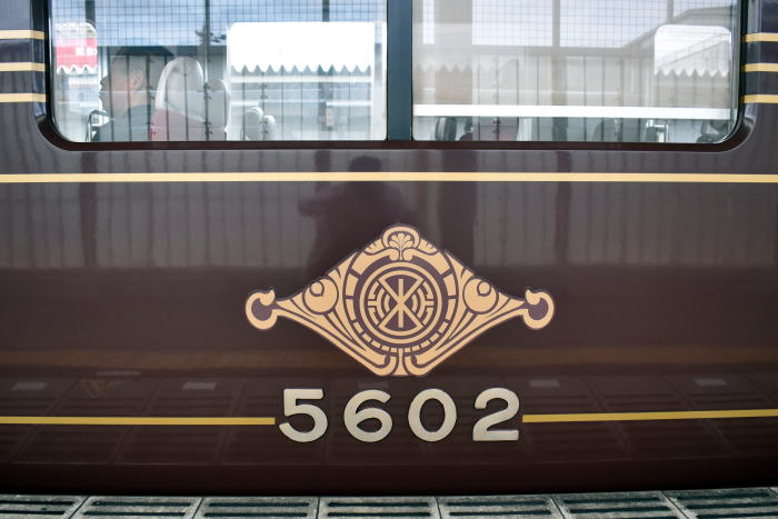 復刻塗装では,漆色車体に金色の模様・大軌社紋が再現されています。
