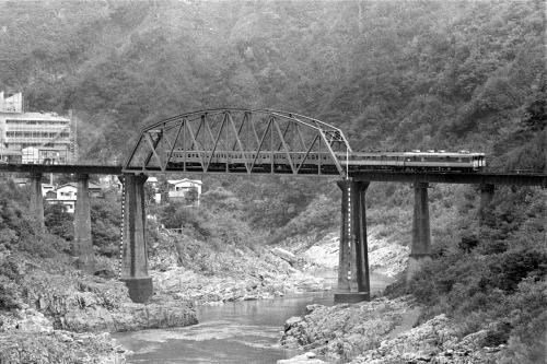 | 土讃本線の小歩危-大歩危間に,吉野川を渡る第二吉野川橋梁があります。 第二吉野川橋梁は, 1935年/昭和10年に架けられた曲弦ワーレントラス橋です。 橋長が249mあり,長編成列車の全景を撮影でき, 当時から,第二吉野川橋梁は鉄道撮影地として注目されていました。 一部のディーゼル列車には, 高松運転所のみに配置の郵政省所有の郵便気動車キユ25形(4輌)が連結されました。 |