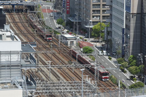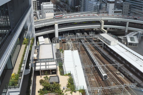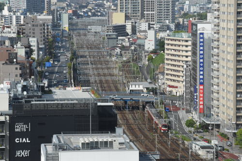 | 横浜駅東空 空中散歩 ◆横浜駅西口に2020年開業のJR横浜タワーの 低層棟の12階に屋上広場“うみそらデッキ”があります。 “うみそらデッキ”からは, 東方向に,JR・東神奈川駅,京急・神奈川駅を望め, JR東海道線,京浜急行線を走る列車を俯瞰できます。 京急・神奈川駅に隣接する青木橋は, 明治3年に架けられた日本最初の跨線橋です(初代)。 |