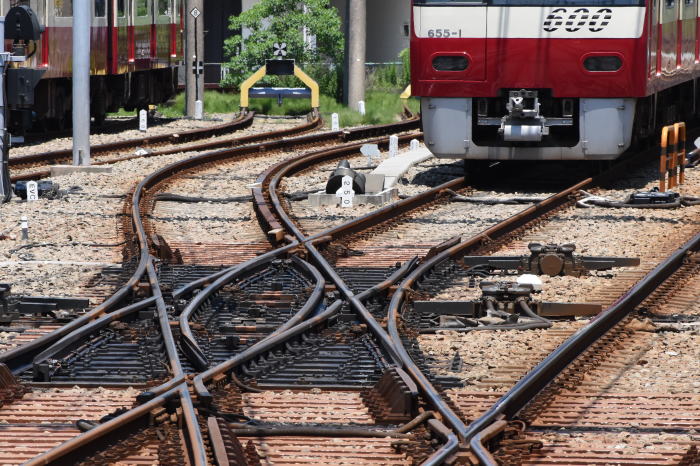| 横浜方向のダブルスリップポイント,留置・600形・655F編成(655-1) 2021.6.10 金沢文庫 | ||