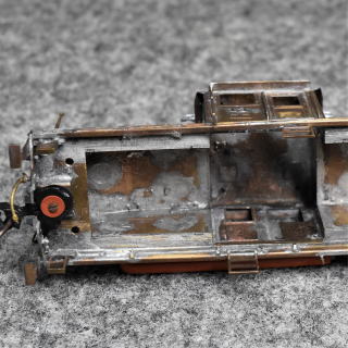つぼみ堂模型店が発売したED25 HOゲージ真鍮キットの自作モデルです。 ・つぼみ堂模型店は1978年/昭和53年に廃業 30年超前に,自由型小型電気機関車として仕掛けました。 車体をはんだ付けで組立て, 手すり,ロストワックスの前照灯などを付けたところで工作を中断していました。 今夏,趣味品の整理中に仕掛品を発見,工作を再開しました。 車体は,ほんとんど仕上げていましたので, ドア/扉の取っ手,連結器解放てこなどを追加して, パンタグラフ,モータと駆動装置,台車を組込みました。 モータは30年超前のカツミ製ヨコ型モータですが,円滑に回転しました。 モータから駆動装置には,スプリングで動力を伝達する仕組みです。 さらに,台車間はユニバーサル・ジョイントで伝動するのですが, プラスチック製ジョイントが劣化していたため,片台車駆動にしました。 こうして,30年超で未塗装モデルとして完成できました。 前照灯と尾灯を点灯するためのLEDライトと塗装のためのエアーブラシも準備しました。 早々に塗装をして,完成したいと思います。 |
