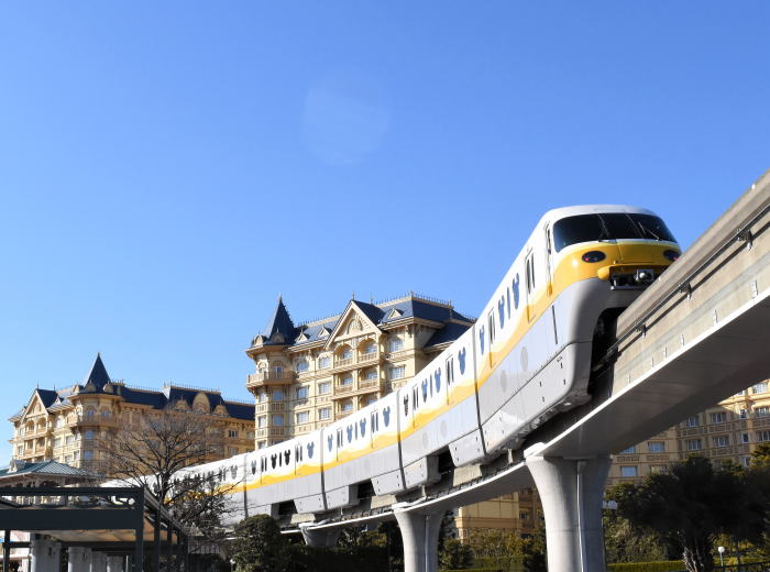 東京ディズニーリゾートに ディズニーランド,ディズニーシー,ディズニーリゾートホテルを周回する 日本跨座式モノレール路線: ディズニーリゾートラインが運行しています。 ディズニーリゾートラインは単線・環状・4駅・全長5kmになっており, 反時計回りに,一周の所要約13分で運転しています。 モノレールカーはリゾートライナーと呼ばれ,自動運転されています。 先頭席は乗客に解放され運転手は乗務せず, ドア扱い・安全監視・案内を行うガイドキャスト(車掌)が乗務しています。 カラフルなライナーが周回するディズニーリゾートラインも ディズニーリゾートのアトラクションの一つとして楽しめました。 |