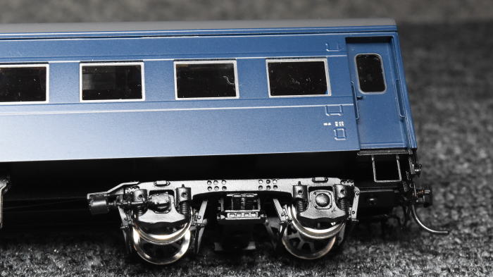 ホビーショップ モアのHOゲージ・真鍮完成モデルの国鉄客車スハ45です。 しっかり組立てられたずっりと重いモデルです。 スハ45は,国鉄が1952-54年/昭和27-29年に53輌を製造した 北海道向けの寒地仕様座席客車で, 二重窓,温気暖房装置,大型蓄電池,歯車駆動方式の車軸発電機などを装備, 北海道内のニセコ,すずらんなどの急行列車に運用されました。 私は,ピノチオ模型店の真鍮組立てキットを多く買いました。 とくに,客車キットは部品点数が少なく安価だったため, 鉄道模型が欲しくなったとき,ついつい買ってしまいました。 客車キットの組立て見本として,市販の真鍮客車モデルの完成度を知りたく, Yahoo!オークションで,このモデルを入手しました。 モデルは,シル・ヘッダをエッチングで表現,室内に座席を配置, 床下機器に簡易な配管,台車に歯車駆動式車軸発電機を付けてありました。 |