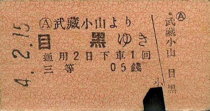| 目黒蒲田電鉄 武蔵小山から目黒ゆき乗車券 1929年/昭和4年2月15日 武蔵小山驛発行 | ||