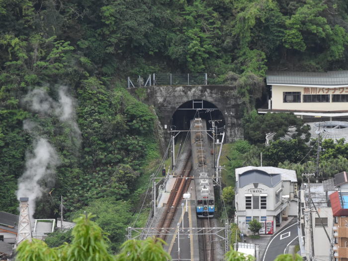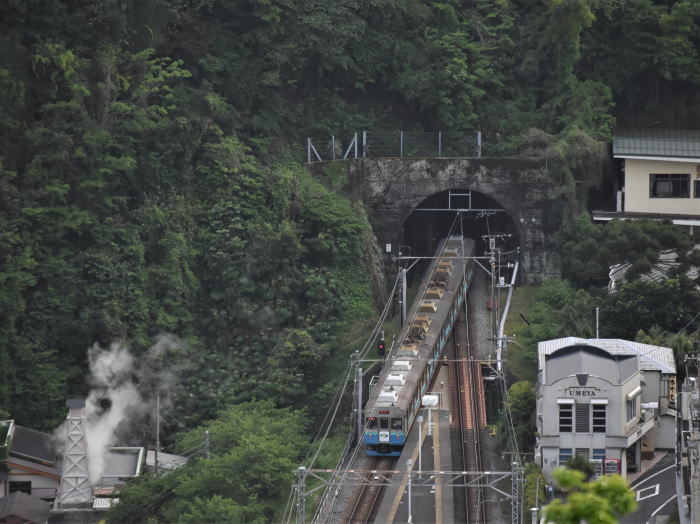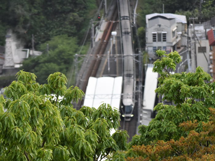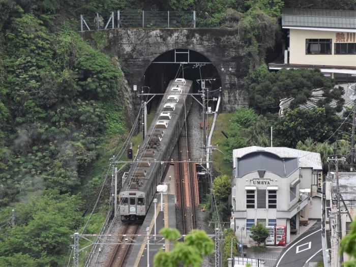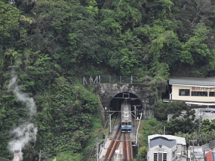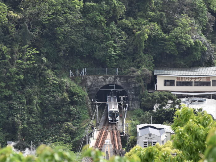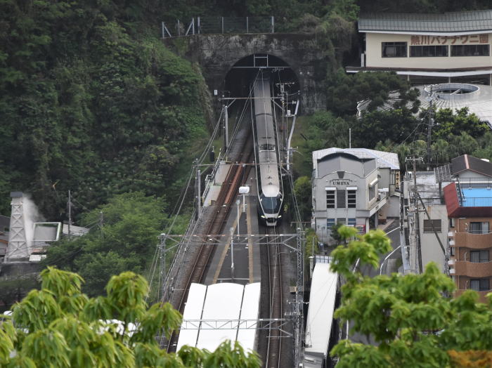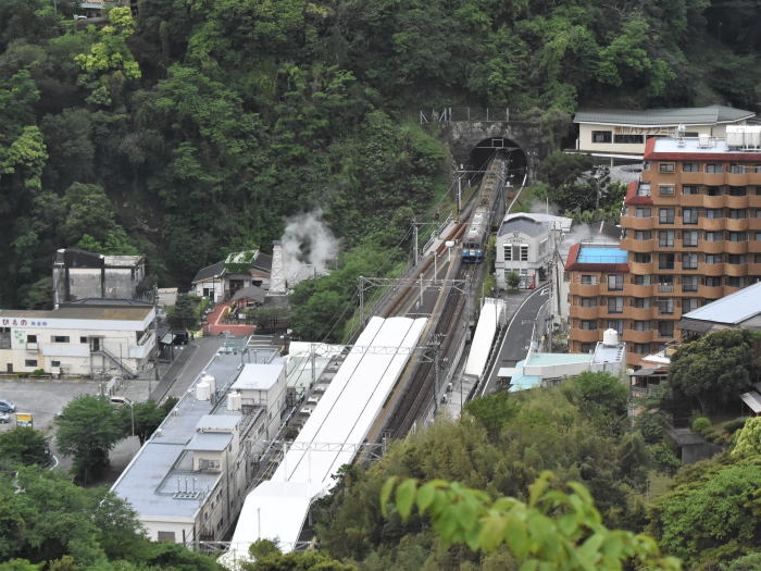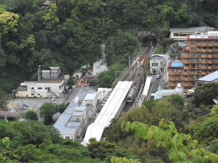 | 伊豆急/伊豆熱川駅上空散歩 ◆伊豆熱川温泉の高台にあるホテル・熱川ハイツから 伊豆急行線を走る列車を撮影しました。 ホテルは,伊豆熱川駅北側の高台に位置し, 伊豆熱川駅のホームと下田寄りトンネルを俯瞰できます。 伊豆急行線は単線のため, 多くの列車は,伊豆熱川駅で上下列車が交換します。 トンネルを抜けて伊豆熱川駅に到着する 8000系,JR東日本 261系・257系を撮影しました。 |