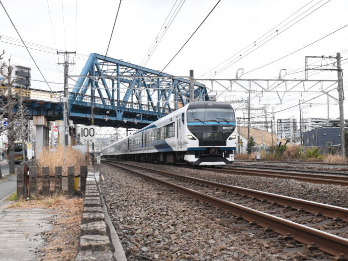 朝の特急“湘南”運用を終えたE257系2000番台が,貨物線を経由して茅ヶ崎に回送されています。