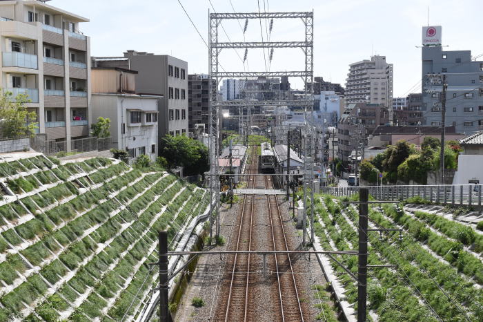 | 洗足池に近い陸橋から洗足池方向を俯瞰・蒲田行1000系1500番台 2023.5.9 |