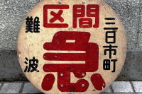 ●南海電鉄・前頭行先板 Last Update 2012.3.1 南海電鉄の先頭車・前頭部らつけられた行先表示板です。 大きな円形板(直径50cm)に,ペンキ書きです。 行先表示板は,遠くから列車種別と行先が判るように工夫されています。 南海電鉄は,急行用に赤色の太字“急”を大きく表示しています。 |