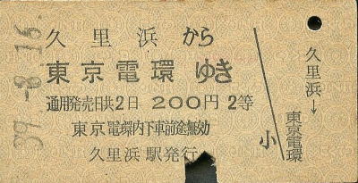 一般式乗車券 久里浜→東京電環 200円 1964年/昭和39年8月16日 久里浜駅発行 |