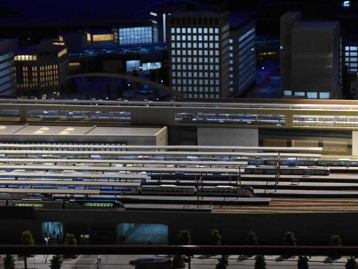 鉄道博物館の人気アイテムは鉄道ジオラマです。 本館2階にある鉄道博物館のジオラマは, 日本最大級の16番ゲージ(在来線1/80・新幹線1/87)レイアウトです。 横幅23m×奥行10mの地形模型に総延長1400mの線路を敷設しています。 約600輌の模型車輌を保有,最大20輌編成の列車を走行できるそうです。 照明の制御により,明け方から日暮れ,夜中を走る列車を再現, 実物どおりの編成を組んで運転していました。 |