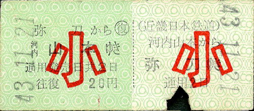 近畿日本鉄道 B型 往復乗車券 小児 河内山本→弥刀→河内山本 20円 1968年/昭和43年11月21日 河内山本駅発行 |