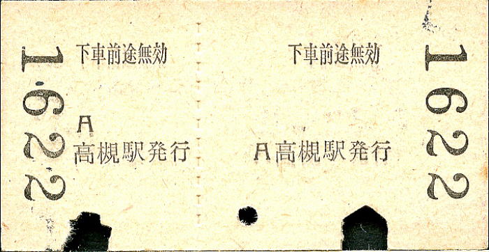 この切符は,1970年/昭和45年8月17日,高槻駅発行の 往路: 高槻から新大阪ゆき,復路: 新大阪から高槻ゆきのA型往復乗車券です。 普通乗車券には,片道乗車券,往復乗車券,連続乗車券の3種類があります。 片道乗車券は,A駅からB駅までの乗車券です。 往復乗車券は,A駅とB駅間で「ゆき」と「かえり」を同じ経路で利用する場合の乗車券です。 連続乗車券は,A駅からB駅で折り返すなどしてC駅までのように,片道・往復にならない場合の乗車券です。 往復乗車券はわが国の鉄道創成期: 明治7年に阪神間で発行されたそうです。 A型 往復乗車券が一般的ですが,小型のB型,券面文字が多い場合にD型,C型が採用された乗車券があります。 様式についても,時期・地域により異なるようです。 小児用は小児断線で切り取りました。 国鉄では往復運賃について往復割引の規定はなく,片道運賃の2倍とされていましたが, 1960年/昭和35年に,片道1000km以上で復路運賃を2割引にしています。 現在,JR線では,片道601km以上の場合は, 往復割引乗車券として「ゆき」「かえり」ともそれぞれ片道運賃から1割引した金額で発売されています。 |